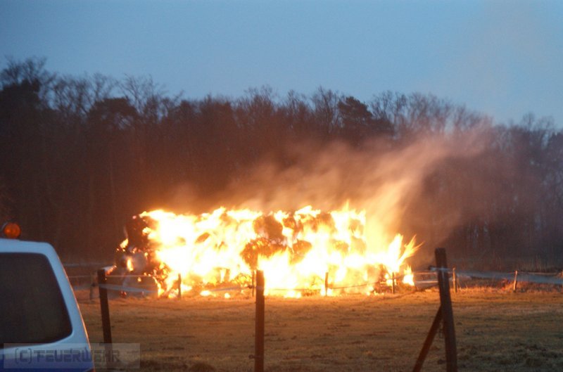 Unbekannte zündeten Strohballen an.......Am frühen Abend des 09. März 2013 zündeten bislang unbekannt Täter eine Strohballenmiete mit Rund 30 Rundballen nördlich der Autobahn 39 nahe Cremlingen an. Da schon die gesamte Miete in voller Ausdehnung brannte, konnten die alarmierten Feuerwehrkräfte aus Cremlingen und Klein Schöppenstedt die Ballen nur noch kontrolliert abbrennen lassen. Das Schaden wird von der Polizei auf etwa 3000 Euro geschätzt. Die Einsatzkräfte waren insgesamt rund sechs Stunden vor Ort um eine weitere Ausbreitung auszuschließen. (T.B.).