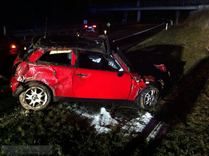 Durch den Zusammenstoß wurde der eine PKW in die Böschung geschleudert und blieb auf dem Dach liegen. Der andere PKW kam an der Mittelleitplanke zum Stehen.