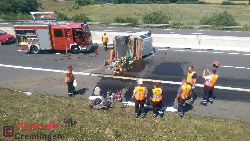 Aus bisher ungeklärten Gründen ist ein Pritschenfahrzeug mit Minibagger auf einem Anhänger ins Schleudern gekommen und umgekippt.