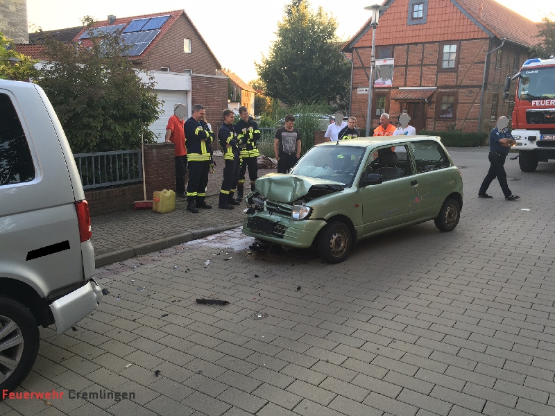 Am frühen Donnerstag Abend wurde die Feuerwehr Cremlingen zur Ölbeseitung im Dorf gerufen. Der Fahrer eines Kleinwagens ist mit einem, hinter der Kurve parkenden, Auto kollidiert und wurde dabei leicht verletzt. Vor Ankuft der Feuerwehr haben die Anwohner bereits Erste-Hilfe Maßnahmen getroffen, sodass der Fahrer direkt an den Rettungsdienst übergeben werden konnte. Aus dem Kleinwagen auslaufende Kühlflüssigkeit und weitere Kleinteile wurden beseitigt - die Straße war für ca. 15 Minuten komplett gesperrt.