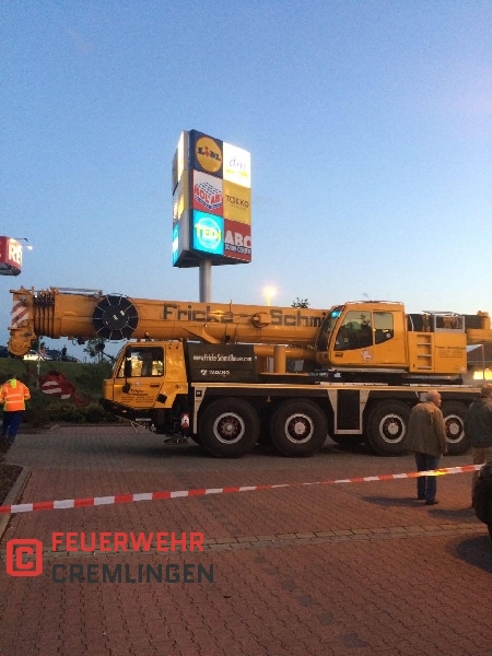 "Werbesäule droht umzukippen" - war das Einsatzstichwort für die Feuerwehr Cremlingen am 13. September gegen 17 Uhr. Hierbei handelte es sich um die 12 Meter hohe Werbesäule des Gewerbegebiets Im Moorbusche. Ein aufmerksamer Passant hatte beobachtet, dass diese durch die heftigen Sturmböen bedrohlich wackelt und folgend die Feuerwehr alarmiert. Das gesamte Fundament war in Bewegung und es konnte nicht gewährleistet werden, dass die Werbesäule dem Sturm 'Sebastian' sicher standhält. Der unmittelbare Bereich und die Geschäfte des Gewerbegebiets wurden durch die Feuerwehrleute abgesperrt, um im Unglücksfall Schäden zu minimieren. Anschließend mussten zwei Kranwagen bestellt werden um die Säule zu demontieren und diese sicher auf dem Parkplatz zu platzieren. Um etwa 23 Uhr war der Einsatz für die Feuerwehr Cremlingen und alle weiteren Beteiligten beendet.