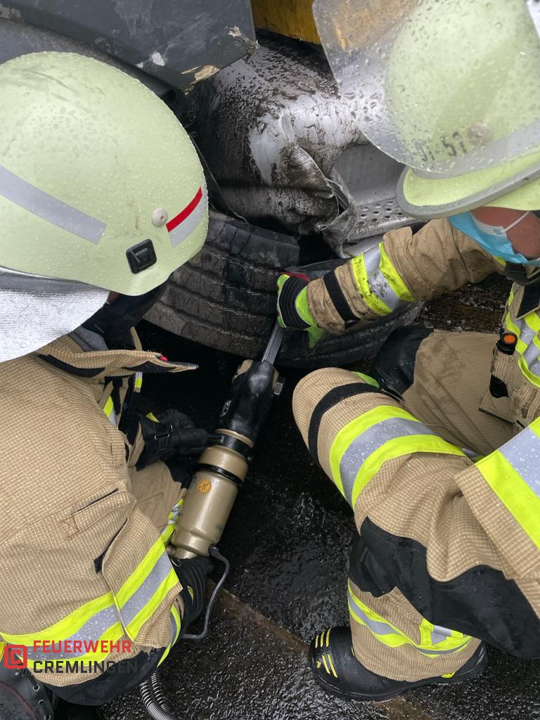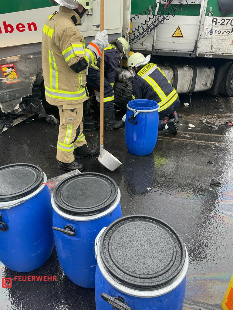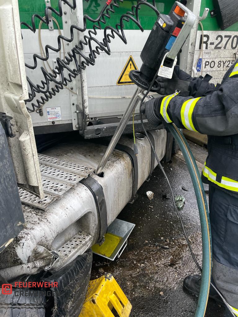 Der Lastkraftwagen wurde mittels Seilwinde aus der Leitplanke gezogen, um anschließend den Tank provisorisch abzudichten. Der Kraftstoff wurde aus dem linken Tank des Lastkraftwagens abgesaugt.