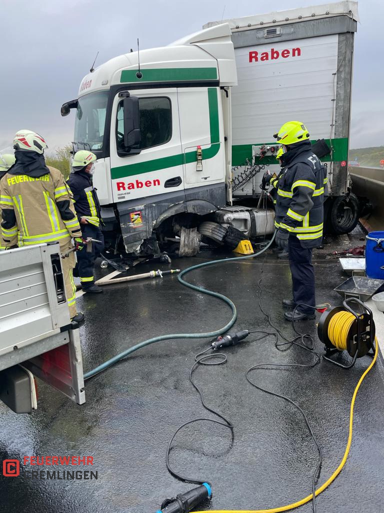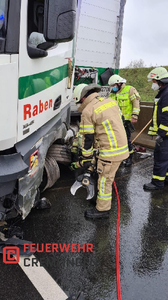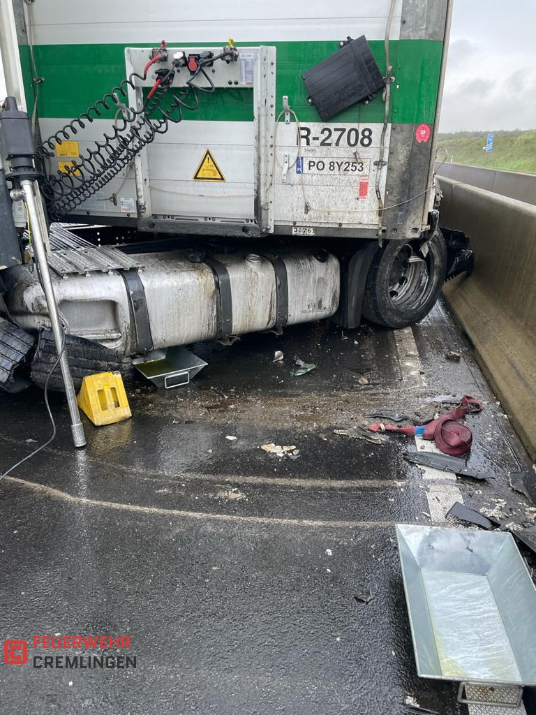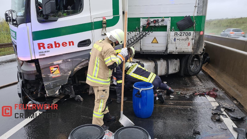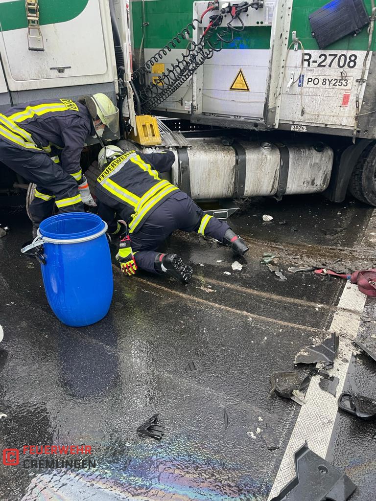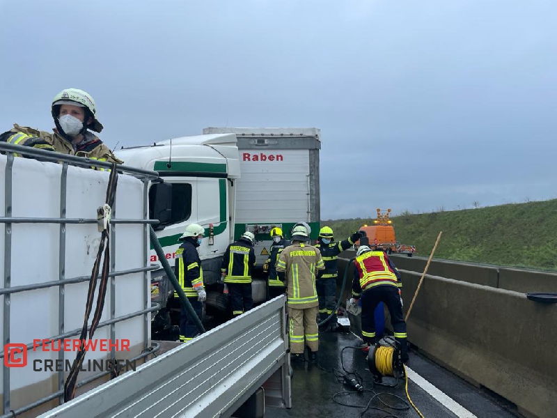 Ein Lastkraftwagen kollidierte aus unbekannten Gründen mit der linken Seitenbegrenzung der A39. Hierbei beschädigte er seinen Treibstofftank an der linken Fahrzeugseite so sehr, dass Kraftstoff auslief. Die Feuerwehr Cremlingen richtete eine Barriere ein, damit der Kraftstoff sich nicht ungehindert auf der Straße verteilen konnte.