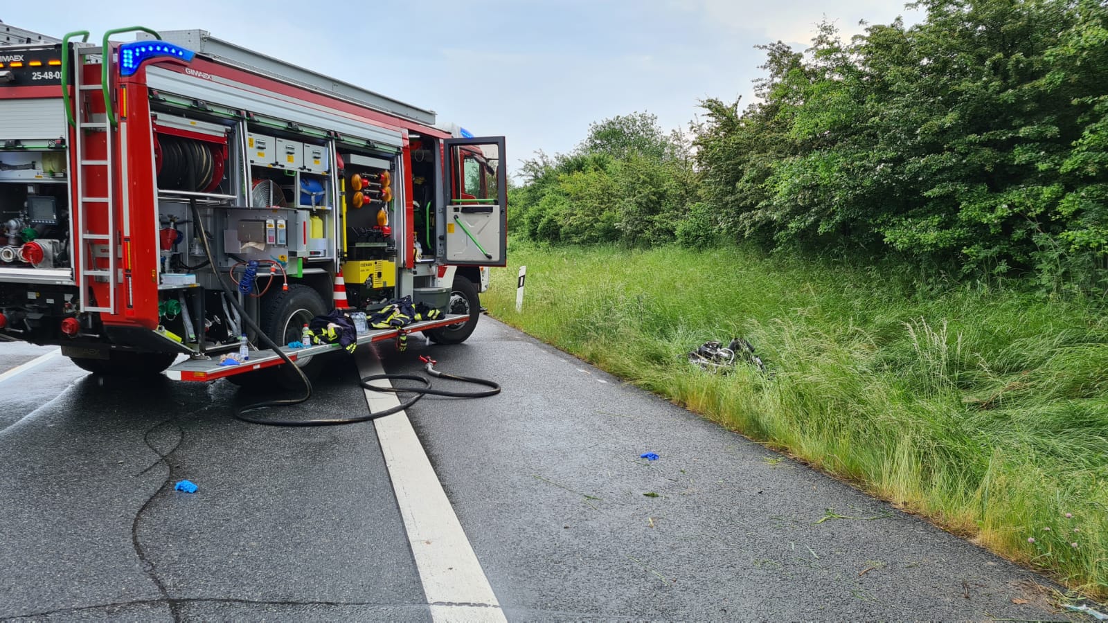 Aus noch ungeklärter Ursache kam der Fahrer eines in Richtung Wolfsburg fahrenden Fahrzeuges von der Fahrspur ab und kollidierte mit der rechten Fahrbahnbegrenzung. Das Fahrzeug überschlug sich infolgedessen mehrmals und erfasste einen unter der Brücke stehenden Motorradfahrer.